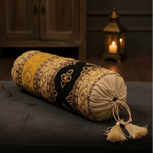 Hand Sequin - Queen Black Tissue Box  It’s 9 by 13.5 inches of heavy ‘Jacquard’ fabric, with embroidery of hand sequin & beads work, lined with polyester padding for added texture, quality & design. enhanced with golden tussles on both sides.
